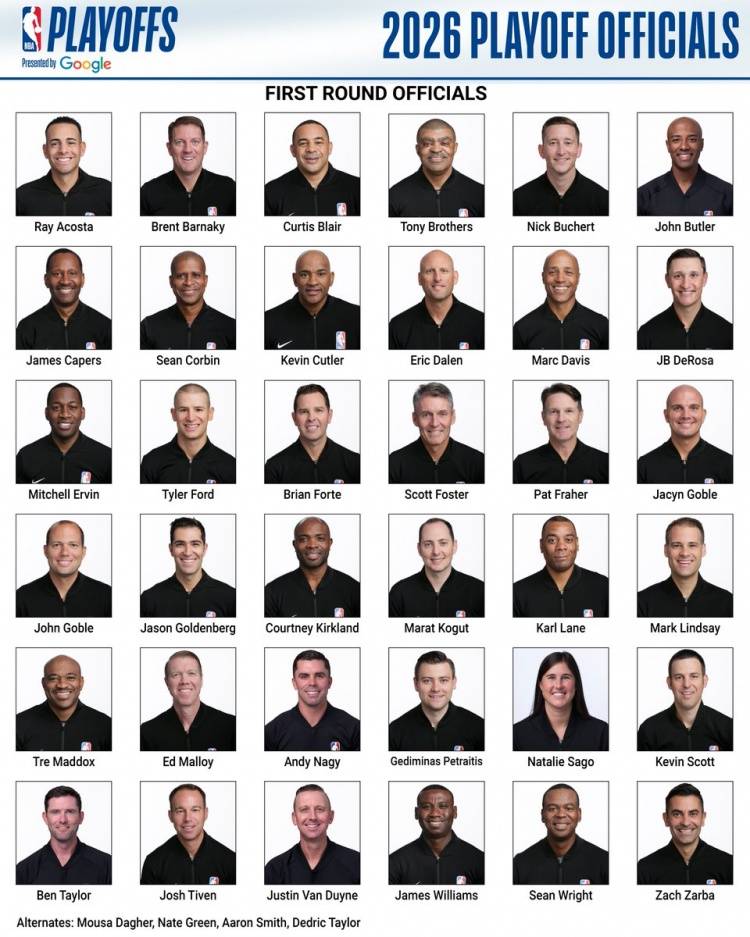 北京时间4月14日,NBA官方公布了本赛季附加赛和季后赛首轮的36人裁判大名单,福斯特、托尼兄弟等悉数在列。